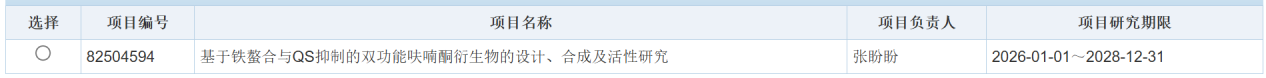2025年8月27日,国家自然科学基金委员会公布本年度立项结果,威廉希尔体育张盼盼博士主持的《基于铁螯合与QS抑制的双功能呋喃酮衍生物的设计、合成及活性研究》项目获批青年科学基金,获资助30万元。这是威廉希尔体育国家级基础研究项目又一重要突破,充分展现了威廉希尔体育青年科研人员的创新活力与学术潜力。